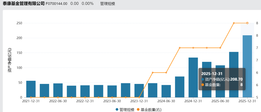2025年,泰康基金权益基金尤其是ETF产品实现了大幅增长,全年该类产品规模208.7亿元,与前一年相比增长55.9%。