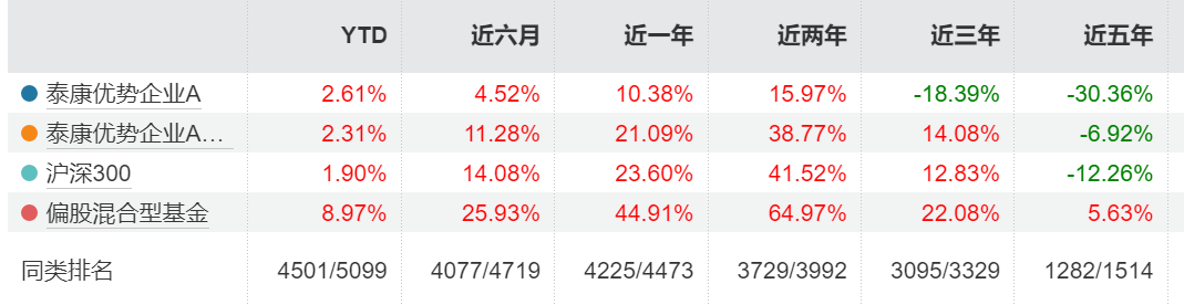 数据显示,泰康优势企业混合A自2020年12月22日成立,近一年、近两年业绩表现较好,收益率分别为10.38%、15.97%,拉长时间线来看,近三年和近五年收益率分别为-18.39%、-30.36%,截至目前净值仅0.7029元。