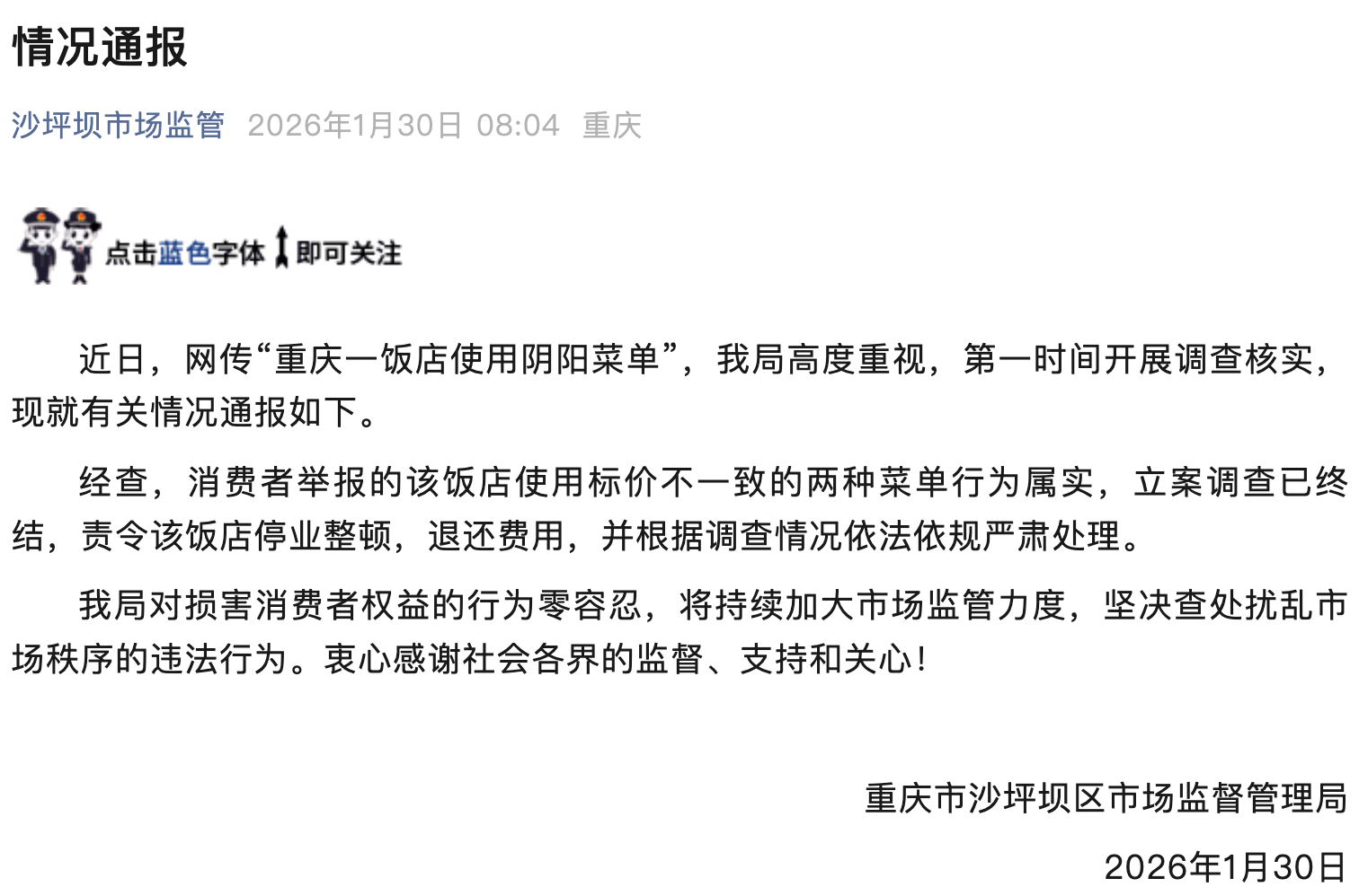 重庆市沙坪坝区市场监督管理局1月30日通报:近日,网传“重庆一饭店使用阴阳菜单”,我局高度重视,第一时间开展调查核实,现就有关情况通报如下。
