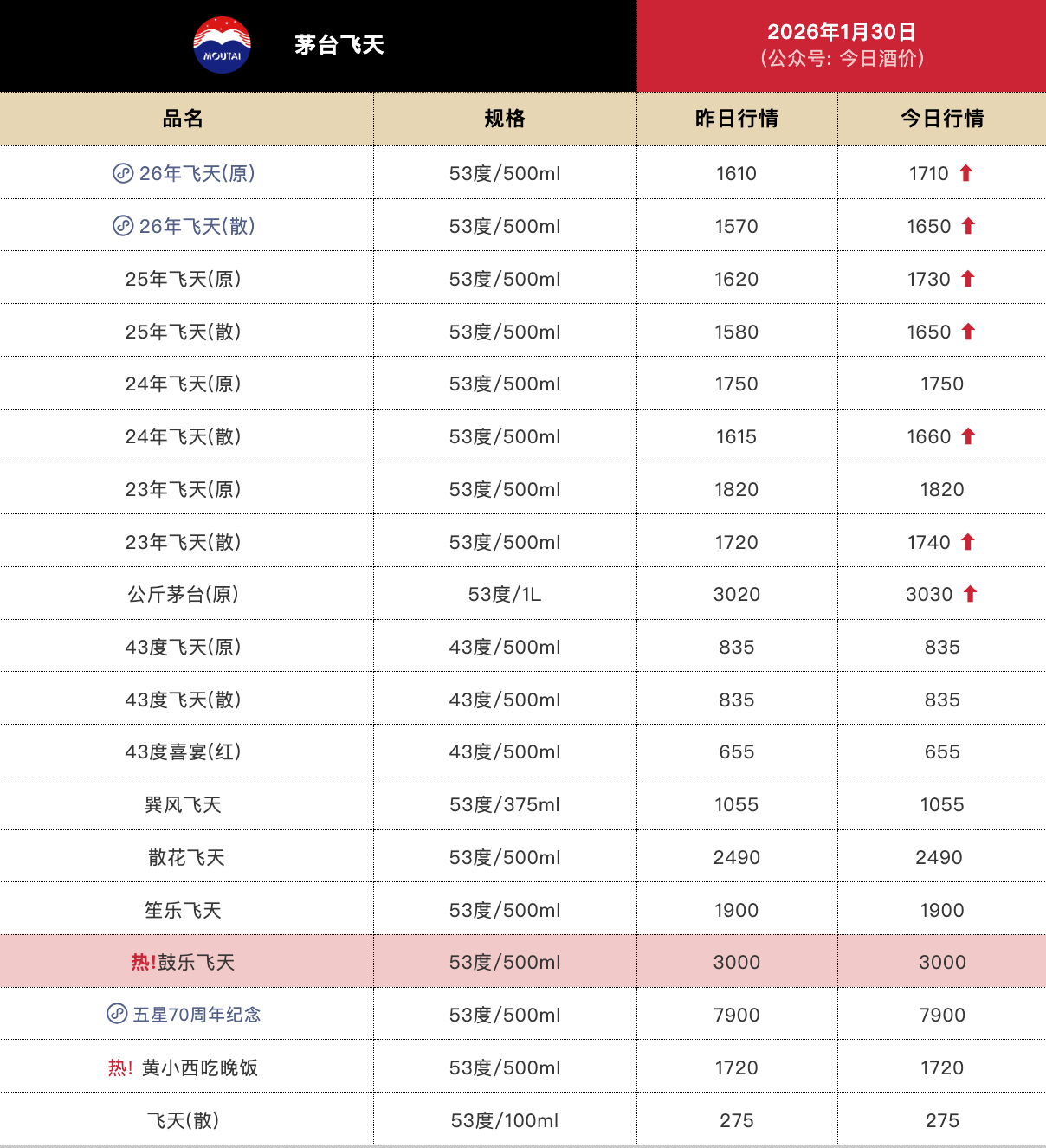 “今日酒价”披露的批发参考价显示,1月30日,26年飞天茅台原箱较前一日上涨100元,报1710元/瓶;26年飞天茅台散瓶较前一日上涨80元,报1650元/瓶。25年飞天茅台原箱较前一日上涨110元,报1730元/瓶;25年飞天茅台散瓶较前一日上涨70元,报1650元/瓶。24年飞天茅台原箱较前一日持平,报1750元/瓶;24年飞天茅台散瓶较前一日上涨45元,报1660元/瓶。