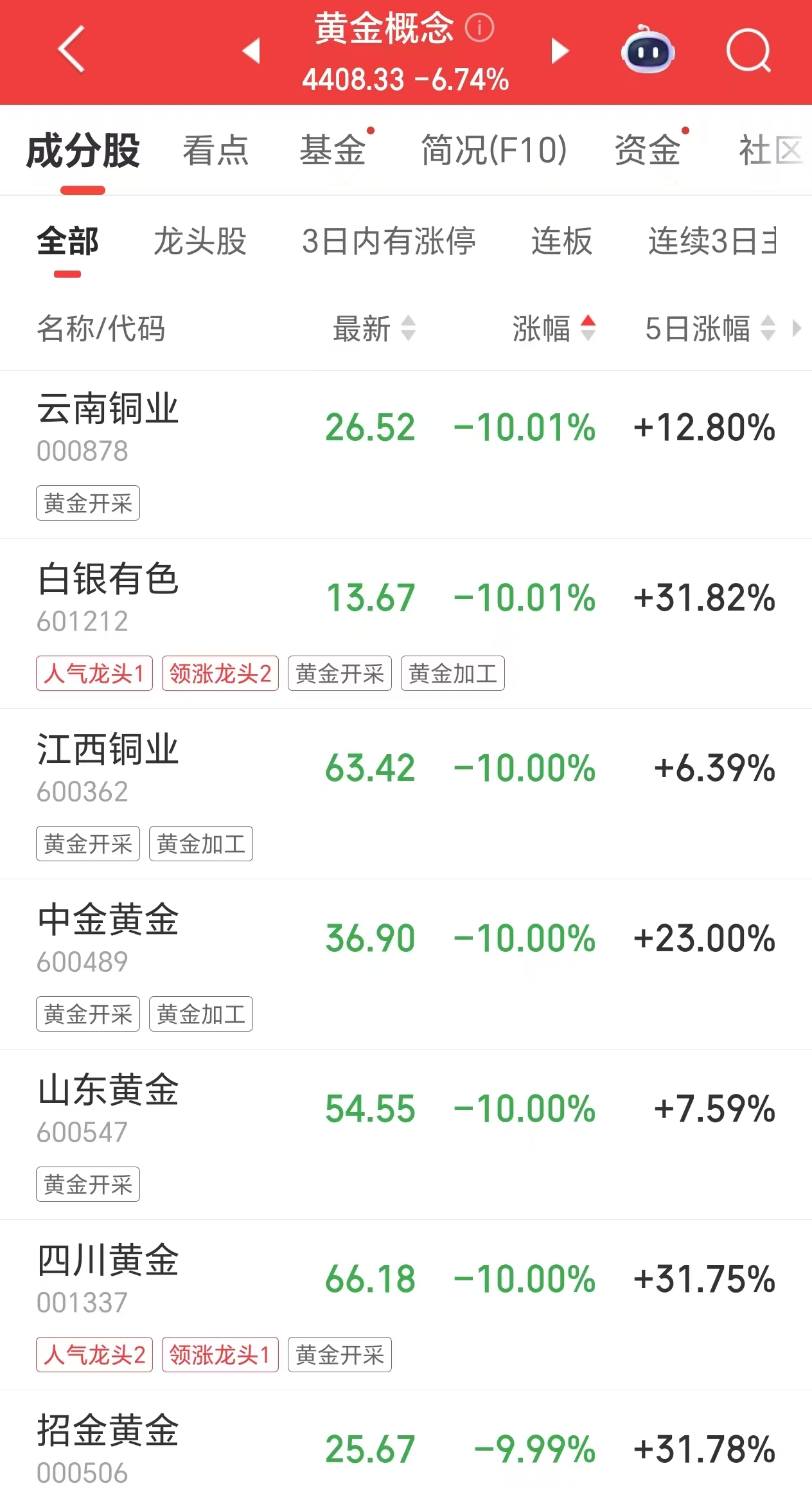 同日,A股黄金概念板块掀“跌停潮”。云南铜业、白银有色、江西铜业、中金黄金、山东黄金、四川黄金、招金黄金、西部矿业等大面积跌停。