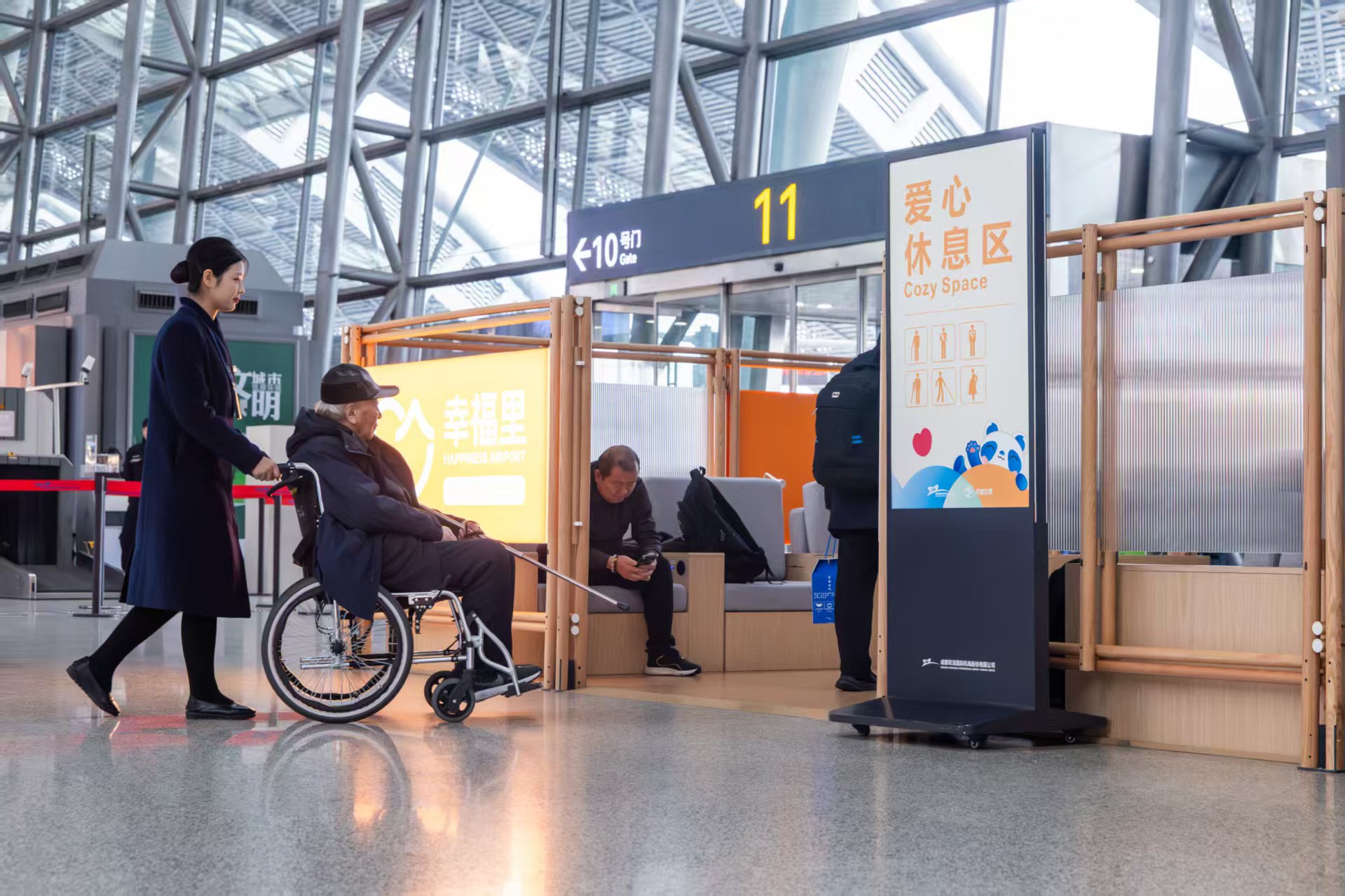为提升旅客出行效率与乘机体验,两大机场各展所长。双流机场创新推出“分类服务手环”,让急到、首乘、特殊旅客得到精准分类、一目了然,从而获得有针对性的及时帮扶;对老年、残障旅客,提供从值机到登机的“一对一”全流程专属服务,并奉上“迎客茶”“银耳羹”等暖心饮品,细节之处尽显温情。天府机场则着力优化大交通衔接,通过改造网约车上客区流线、精细调度停车楼资源、与地铁高铁共享客流数据并建立应急疏运机制,确保旅客抵离高效顺畅。服务上,天府机场设置了环境舒适的集中休息区,为过夜旅客提供提前值机、行李托运、免费过夜用品等便利,并联合航司、地铁等单位升级“爱心帮”服务,为老幼病残孕等重点旅客提供分段式无缝衔接服务。
