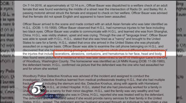 这起华人虐待保姆案还要追溯到去年,2016年7月14日,凌晨时分,明尼苏达州警官鲍尔接到报案,有市民在在伍德伯里市街道上看到一位中国妇人全身是伤、衣衫褴褛,头发蓬乱,双眼充满惊恐地在街上慌乱的小跑。