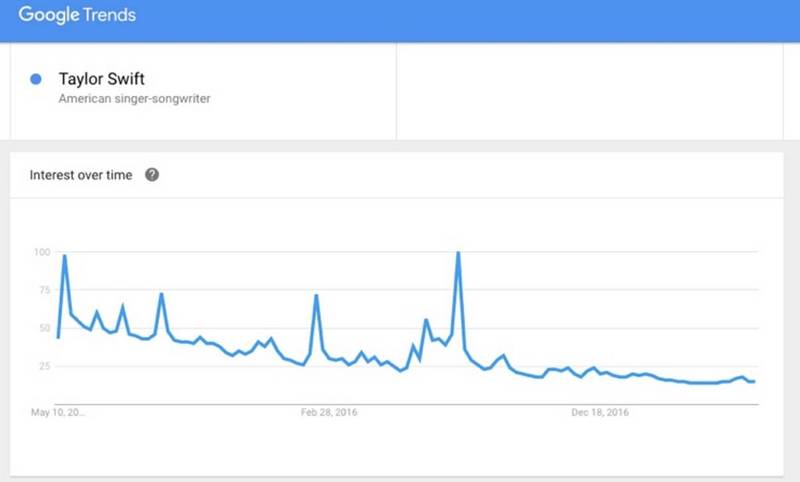 自2014年发行专辑《1989》以来,两年未发行专辑的Taylor Swift在谷歌搜索上的话题热度在逐步递减,而单靠抱紧Apple Music上2700万的付费用户,对于作品在后期市场中的扩散和发酵是远远不够的。因此,向Spotify等流媒体的妥协,其实也是向更广阔市场的妥协。