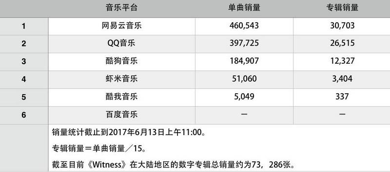 而近年震荡已久的数字音乐市场,在今年上半年也稍显平静。6月9日,Katy Perry全新数字专辑《Witness》在包括腾讯音乐娱乐集团旗下QQ音乐、酷狗音乐、酷我音乐三家平台,已及网易云音乐、虾米音乐、百度音乐6个平台同步上线之后,音乐先声对数字专辑销量进行了统计。