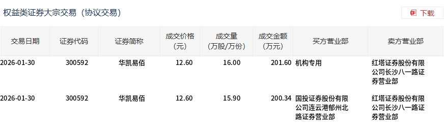 1月30日,华凯易佰大宗交易成交31.9万股,成交额401.94万元,占当日总成交额的1.26%,成交价12.6元,较市场收盘价14.2元折价11.27%。