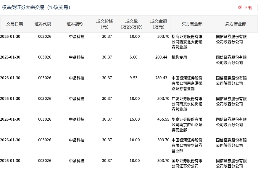 1月30日,中晶科技大宗交易成交71.13万股,成交额2160.22万元,占当日总成交额的10.83%,成交价30.37元,较市场收盘价34.8元折价12.73%。