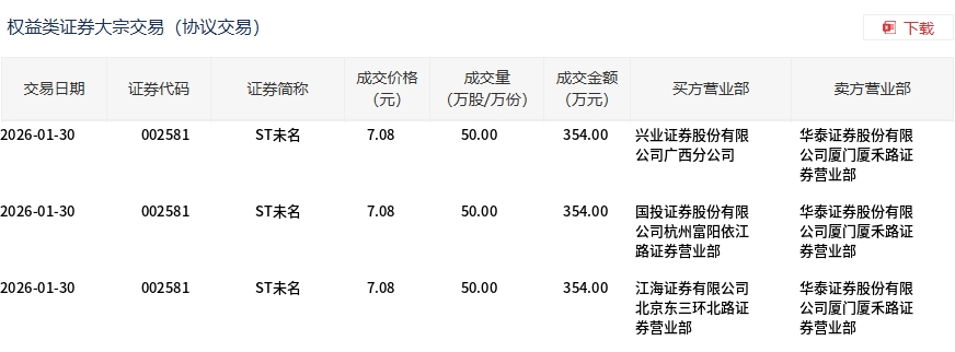 1月30日,ST未名大宗交易成交150万股,成交额1062万元,占当日总成交额的25.05%,成交价7.08元,较市场收盘价7.36元折价3.8%。