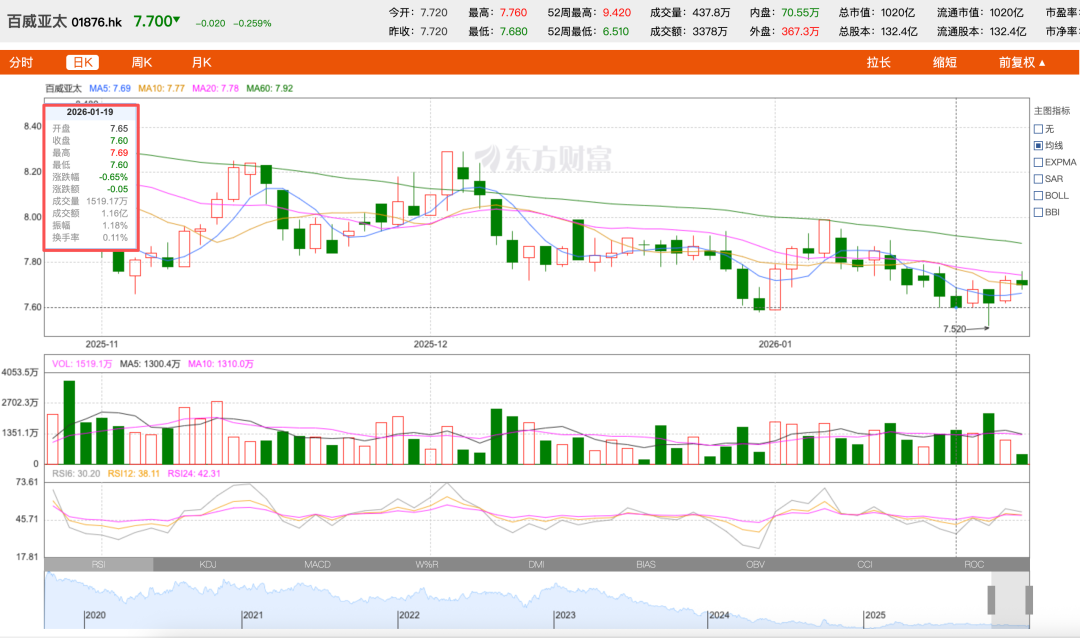 从已上市的港股“前辈”表现可见一斑。以2019年募资近400亿港元上市的百威亚太为例,其股价自2021年后持续走低,即便在2025年港股牛市中也表现疲弱,个股累计涨幅仅1.34%。2026年1月19日收盘,百威亚太录得7.72港元/股,较发行价27港元/股蒸发71.4%。