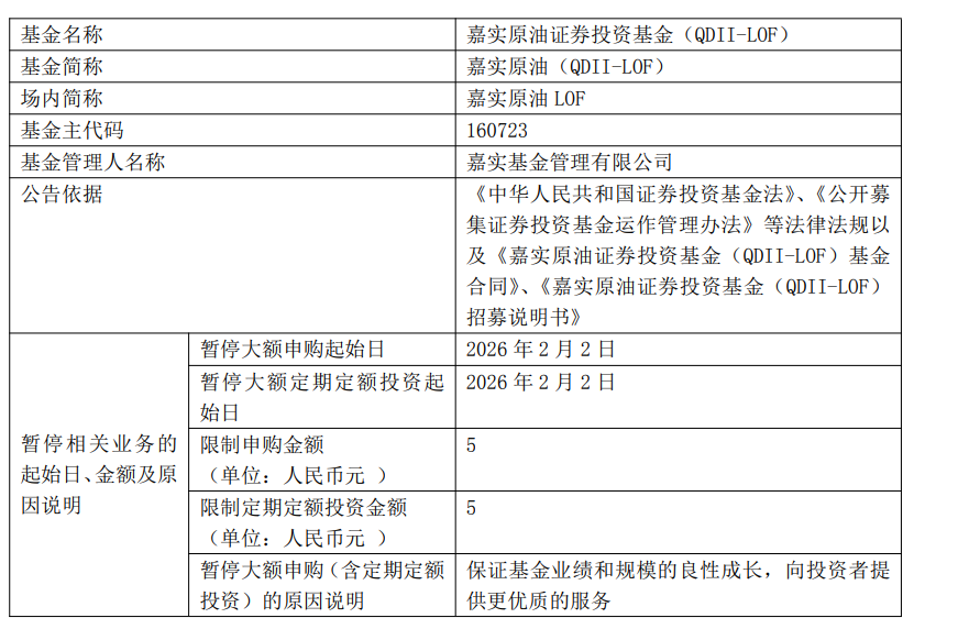嘉实原油LOF1月30日公告,自2026年2月2日起暂停大额申购、大额定期定额投资业务,每日累计投资限额不超过5元。