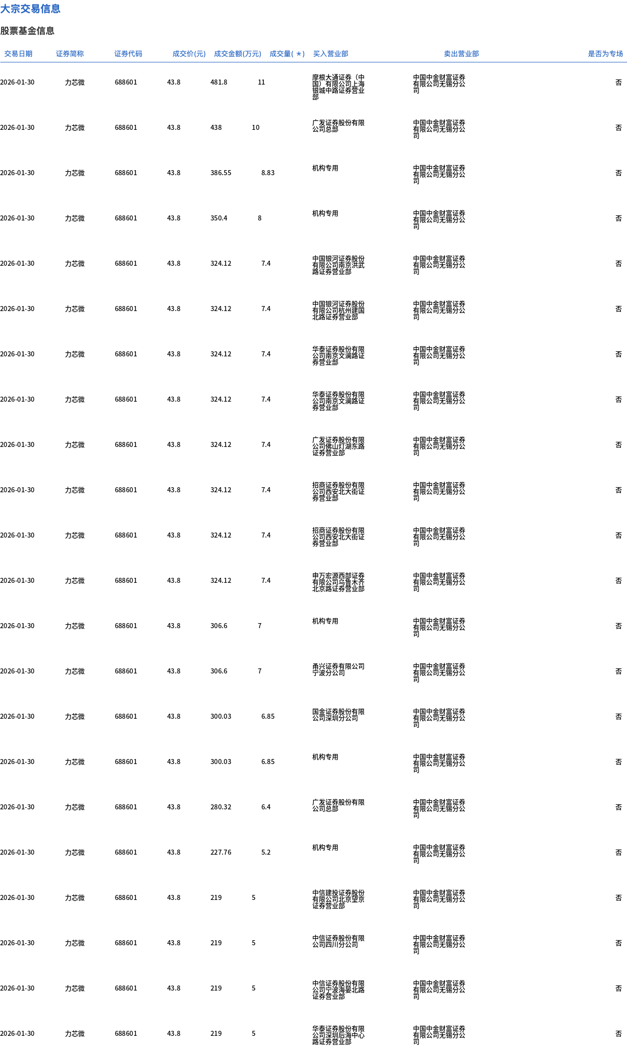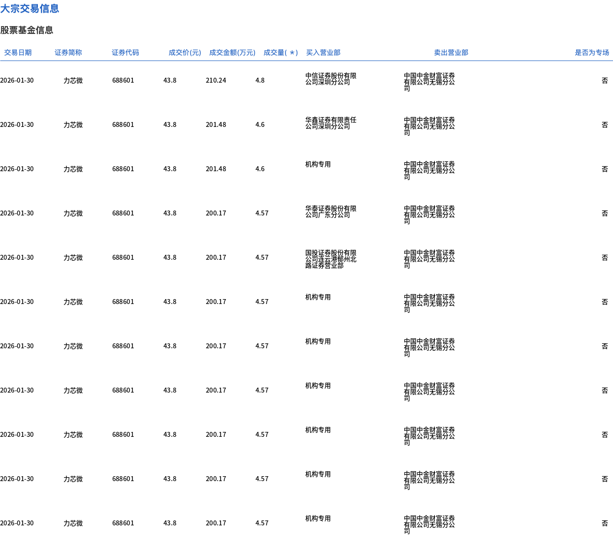 1月30日,力芯微大宗交易成交206.89万股,成交额9061.61万元,占当日总成交额的17.03%,成交价43.8元,较市场收盘价50.97元折价14.07%。