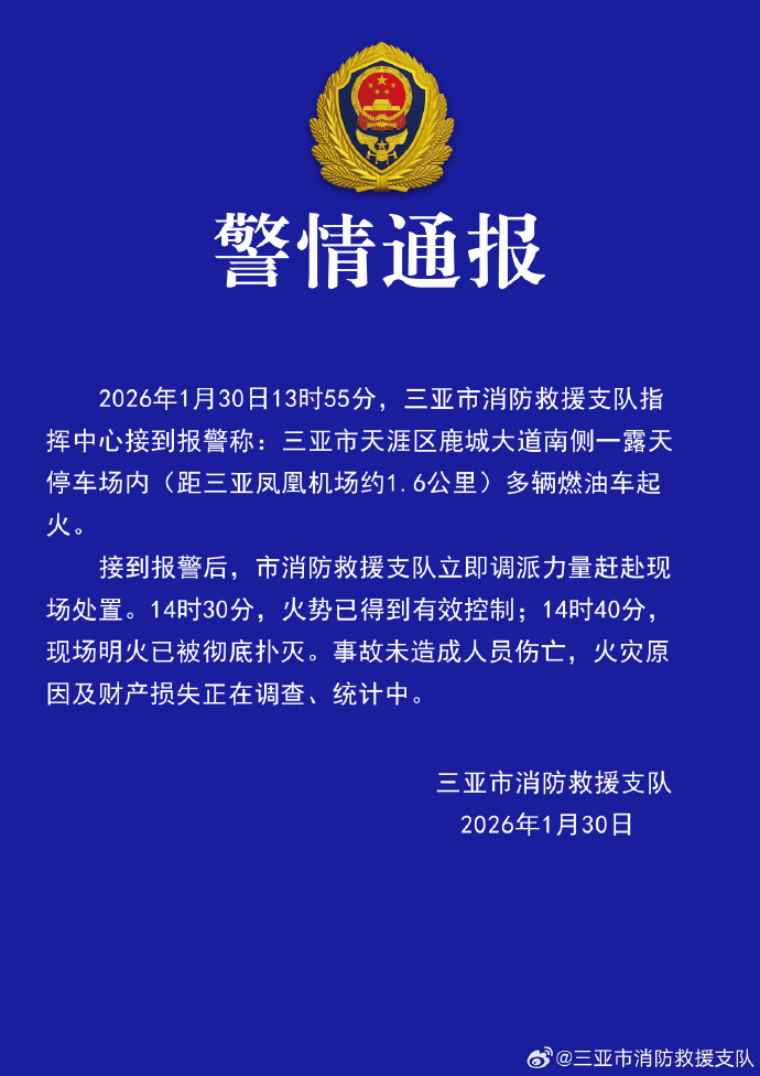 三亚一露天停车场内多辆燃油车起火,未造成人员伤亡