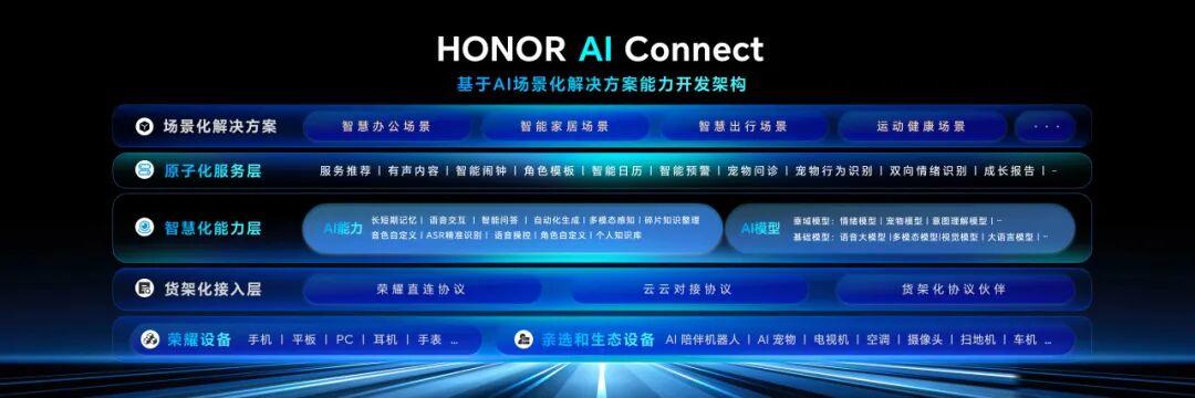 同年10月,在荣耀首届全球开发者大会暨AI终端生态大会上,荣耀宣布HONOR Connect正式升级为HONOR AI Connect平台。该平台为生态合作伙伴作为智慧化入口,支持语音、视觉等多模态交互,以实现即插即用的AI能力接入。