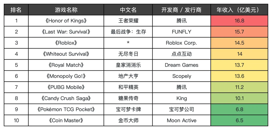 而这,已经是游戏出海连续第六年突破千亿大关。这一年,全球最赚钱的TOP10游戏,揽获了近123亿美元的收入。
