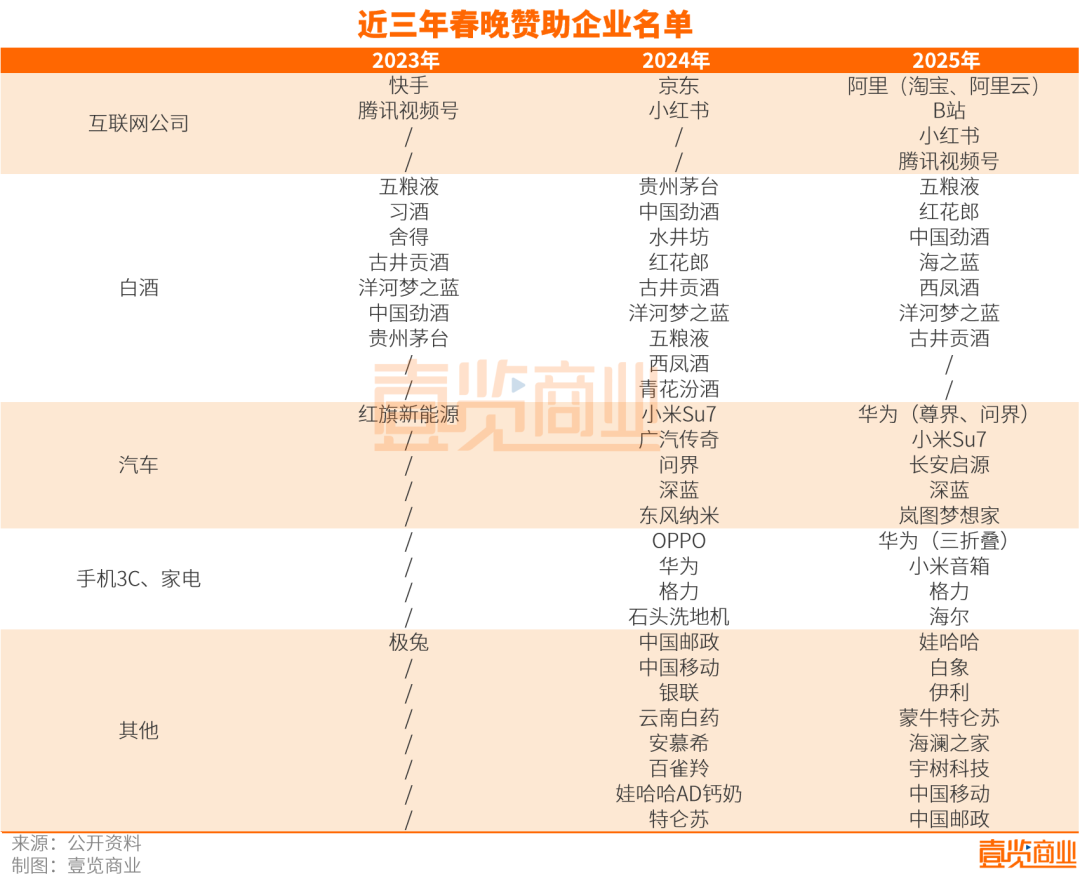 五粮液、贵州茅台、中国劲酒...一批白酒企业早已是春晚舞台的“常客”。据壹览商业统计,白酒是近年春晚连续赞助最频繁的品类。仅2023-2025年,就有12个白酒品牌赞助春晚,其中有10个都赞助了两次以上。