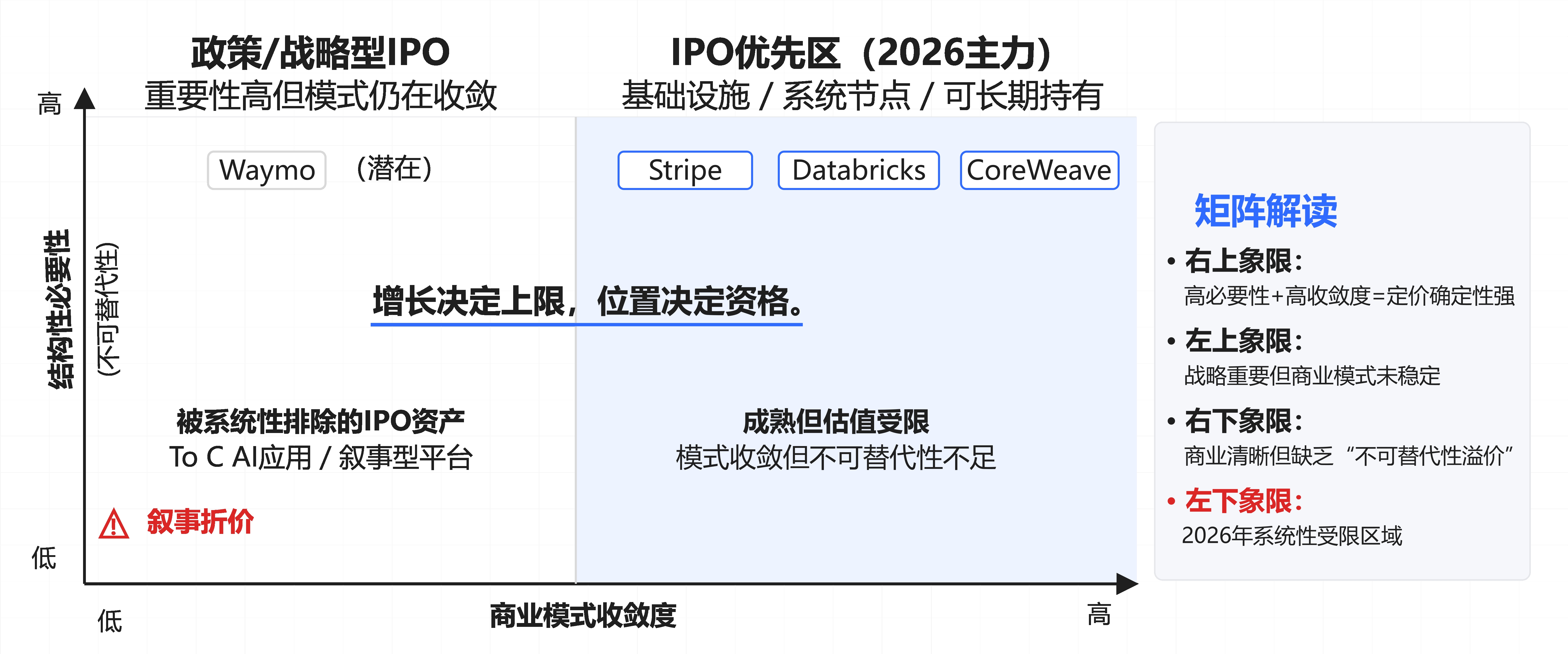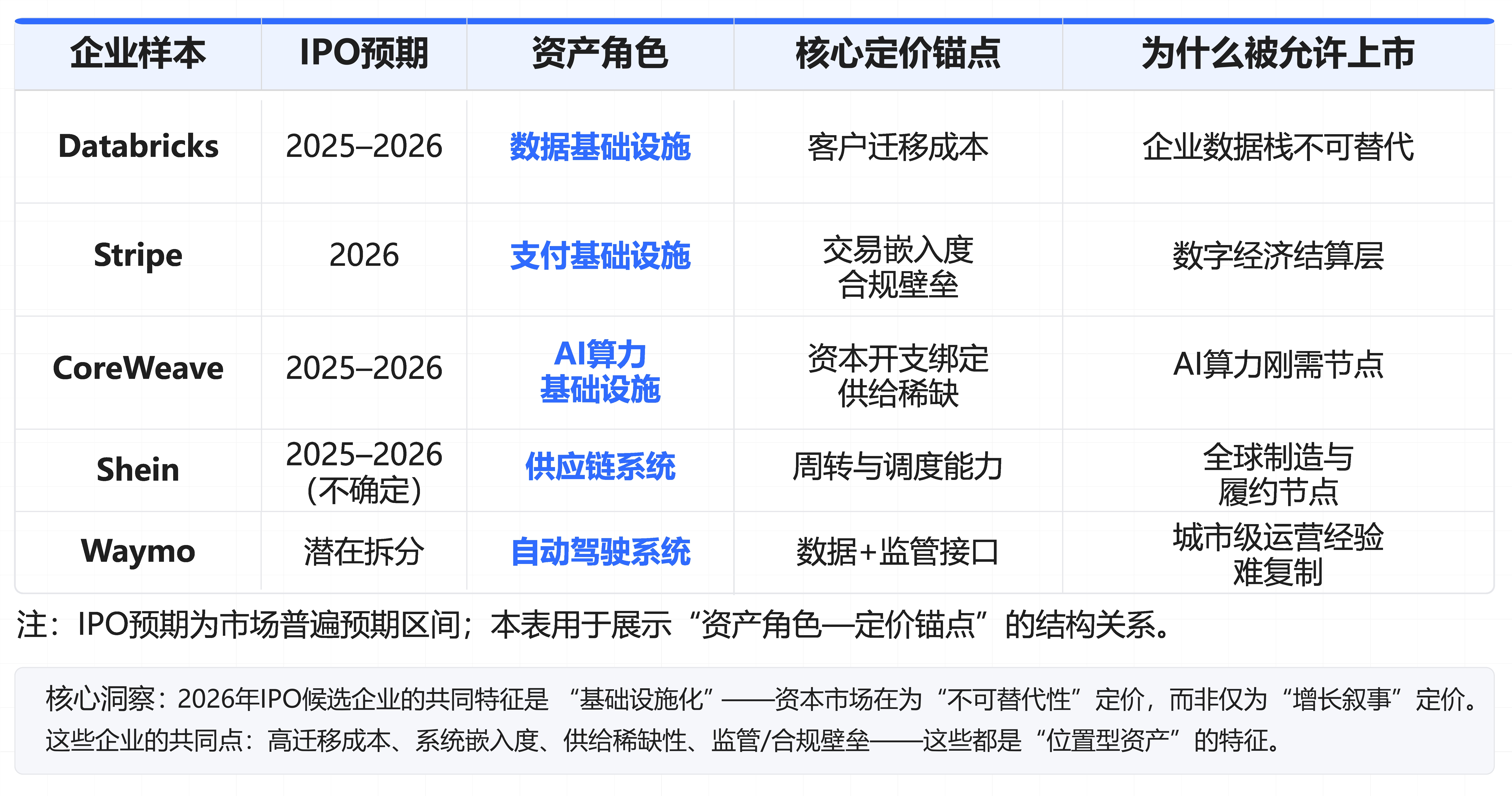 原因在于:Databricks不被当作一家“AI应用公司”,而是被视为数据基础设施层的长期资产——它嵌入企业数据栈,客户迁移成本极高,其收入具有显著的“基础设施黏性”。这个样本说明了一个趋势:2026年的IPO,不是奖励最快的公司,而是确认最“站得住位置”的公司。