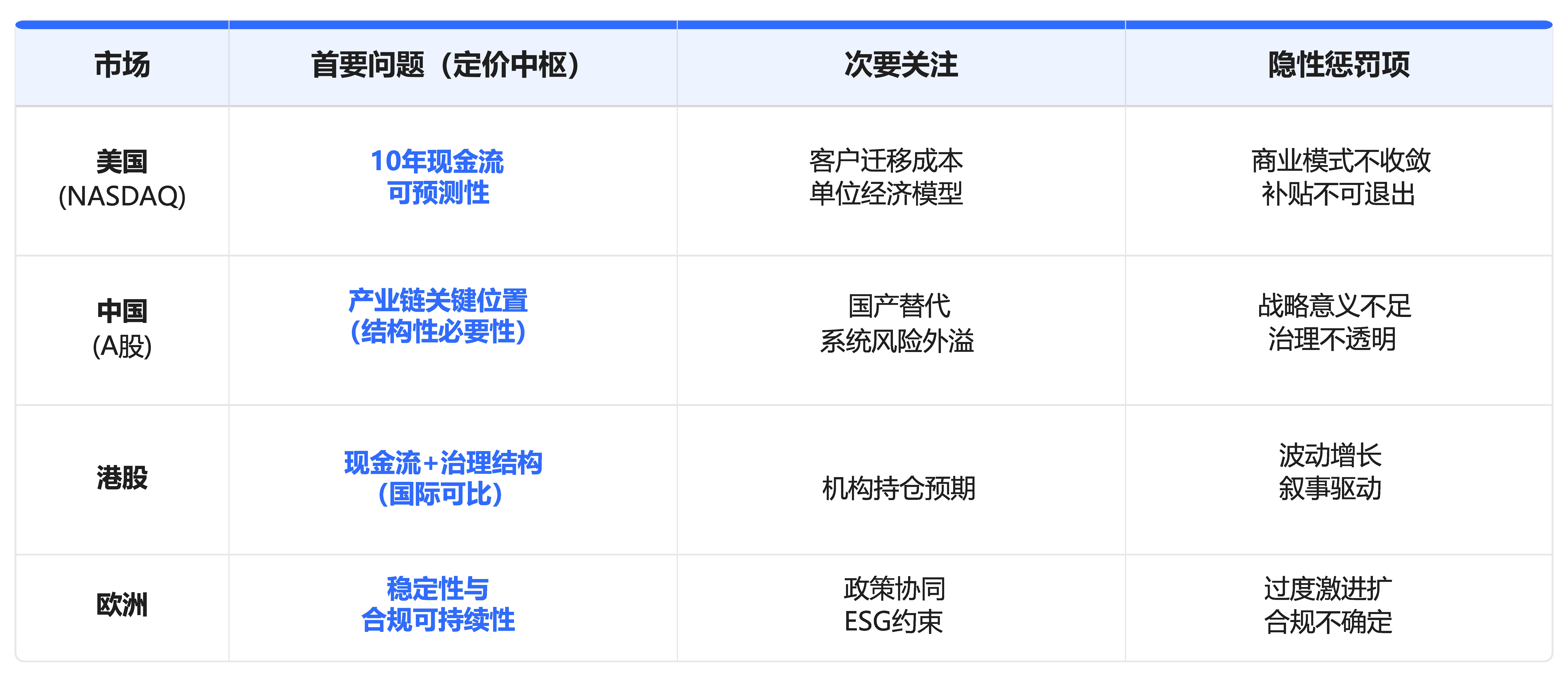 同一家企业,在美国、中国、港股或欧洲,可能获得完全不同的估值结果,这并不意味着某个市场“对或错”,而是反映了各自资本的使用目标。
