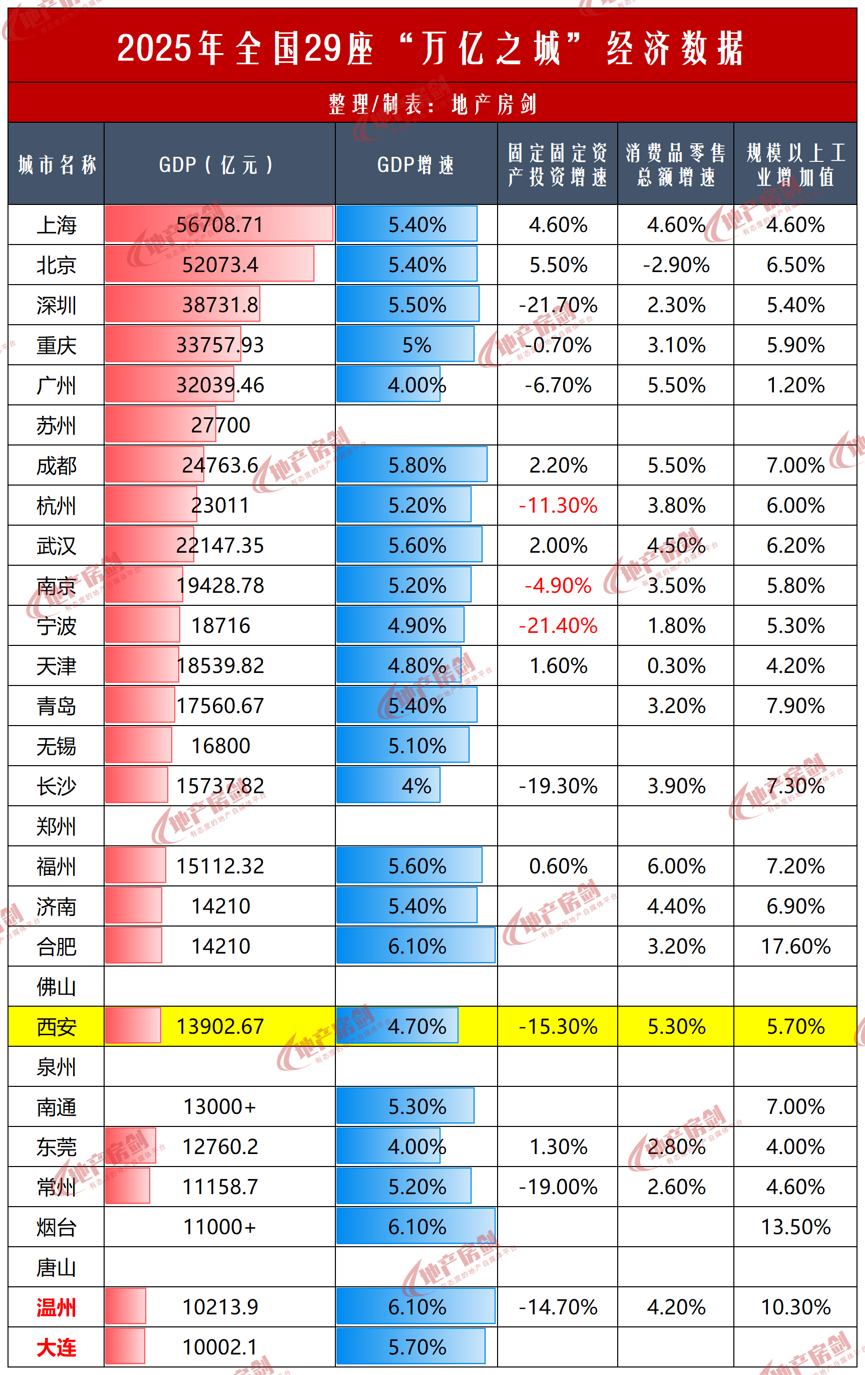 在公布GDP增速的24座城市中,西安4.7%的增速排在第20位,很明显跑输给了全国以及其他城市。