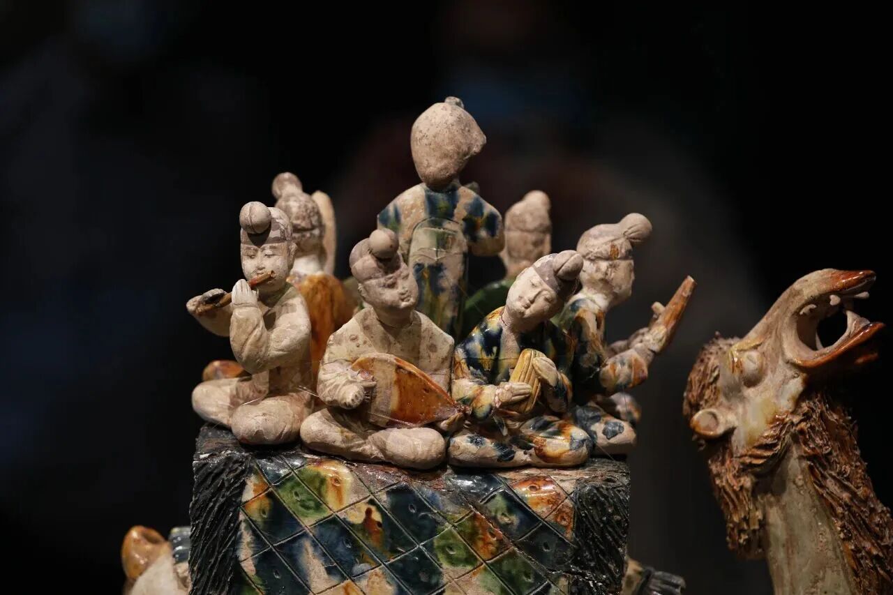 乐手沉醉忘我,女子优雅自信,骆驼沉稳踏乐而行,唐代艺术家用浪漫的手法将舞台设置在驼背上,可谓匠心独具。恍惚间,盛唐的悠扬乐声与婉转歌喉,仿佛就在耳畔流淌。