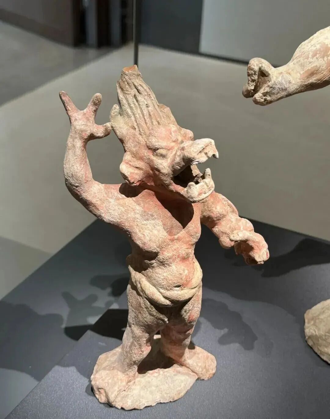 来瞧这件镇墓俑,它表情不耐、嘴巴大张,像被人喊了一声,扭头就怼:“喊我干啥?”