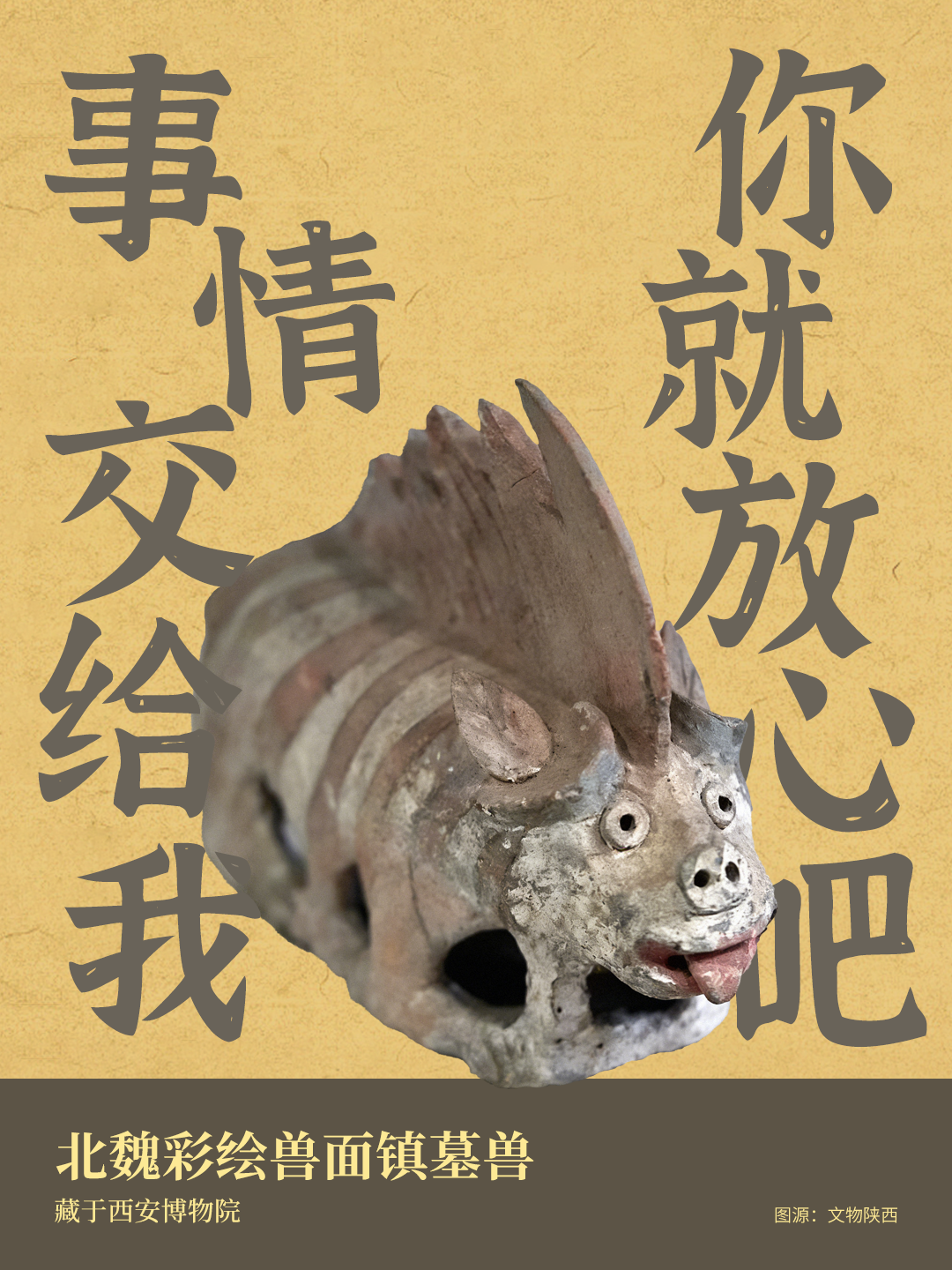你以为镇墓兽都是威严整肃的?其实不然!看这件藏于西安博物院的北魏彩绘兽面镇墓兽,就是一只表情较为丰富的镇墓兽,好像在说“事情交给我,你就放心吧!”