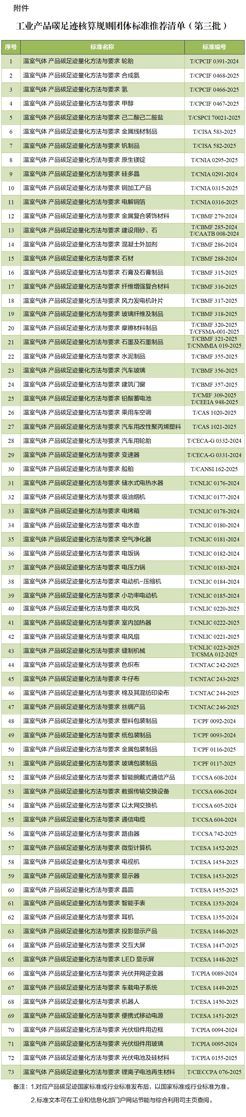 “工信微报”微信公众号2月2日消息,为加快提升工业产品碳足迹管理水平,建立健全碳足迹管理体系,促进工业绿色低碳转型,经相关标准化机构推荐、专家评审、网上公示等程序,工业和信息化部、生态环境部、国家发展改革委、市场监管总局确定了73项工业产品碳足迹核算规则团体标准推荐清单(第三批),现予以公布。