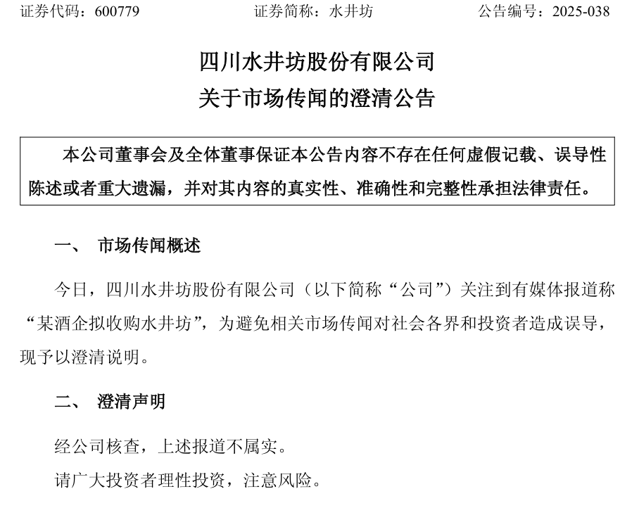2025年年底,市场上就传出了“剑南春收购水井坊”的消息,水井坊股价出现异动,当天收盘涨停。2025年12月26日,水井坊发布澄清公告,否认相关言论。剑南春方面也表示传闻不实。