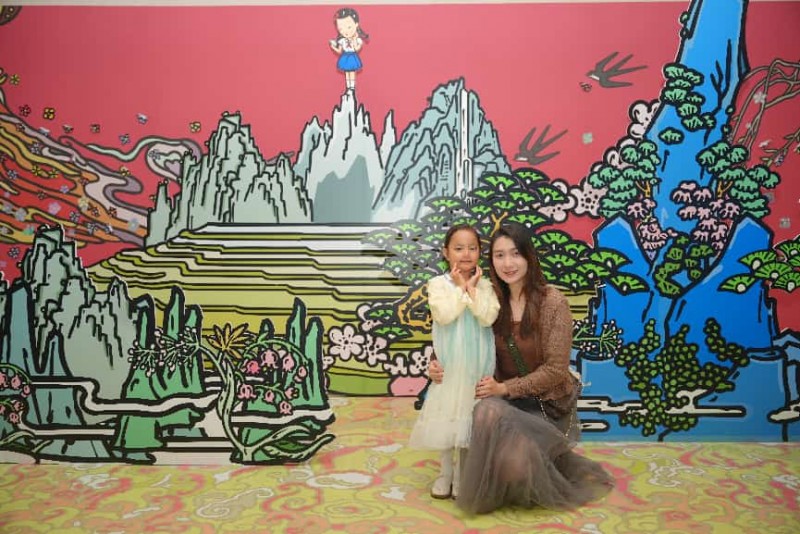 为适配公共空间的观看节奏,我们把“作品”扩展为“场景”。入口处以《最好的早已到来》为名的立体装置像一座时空之门,引导观众完成从日常到艺术的心理切换;40米巨型长屏把巨幕作品变成可被身体感知的光场;而《奇迹般》则以长达26米的壁画尺度,营造出近似美术馆级别的沉浸围合。空间里还被植入“飒蜜和熊”的咖啡店叙事与“送你一朵小红花”的互动区:观众可以在贴纸上写下愿望并贴在墙面,让每一次参与都留下一个小小的可见痕迹。
