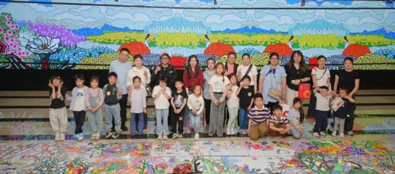 在随后的长卷共创环节,20米长卷《重逢》由亲子家庭共同绘制。孩子们以卜桦作品《奇迹般》《宇宙花园》的美学元素为灵感,以蜡笔、丙烯马克笔等材料进行填色创作,家长协助完成。