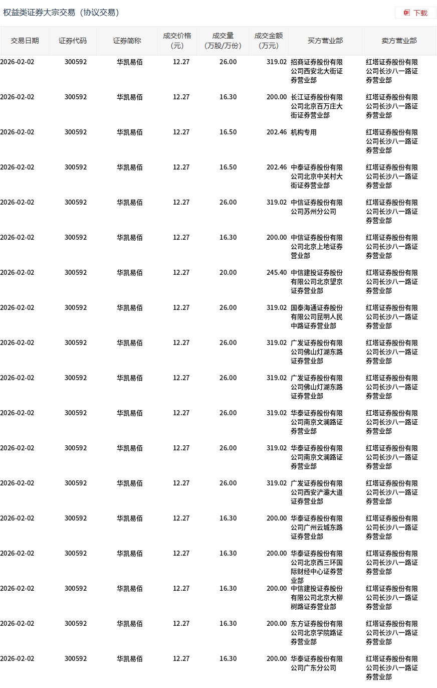2月2日,华凯易佰大宗交易成交375.1万股,成交额4602.48万元,占当日总成交额的17.03%,成交价12.27元,较市场收盘价13.79元折价11.02%。