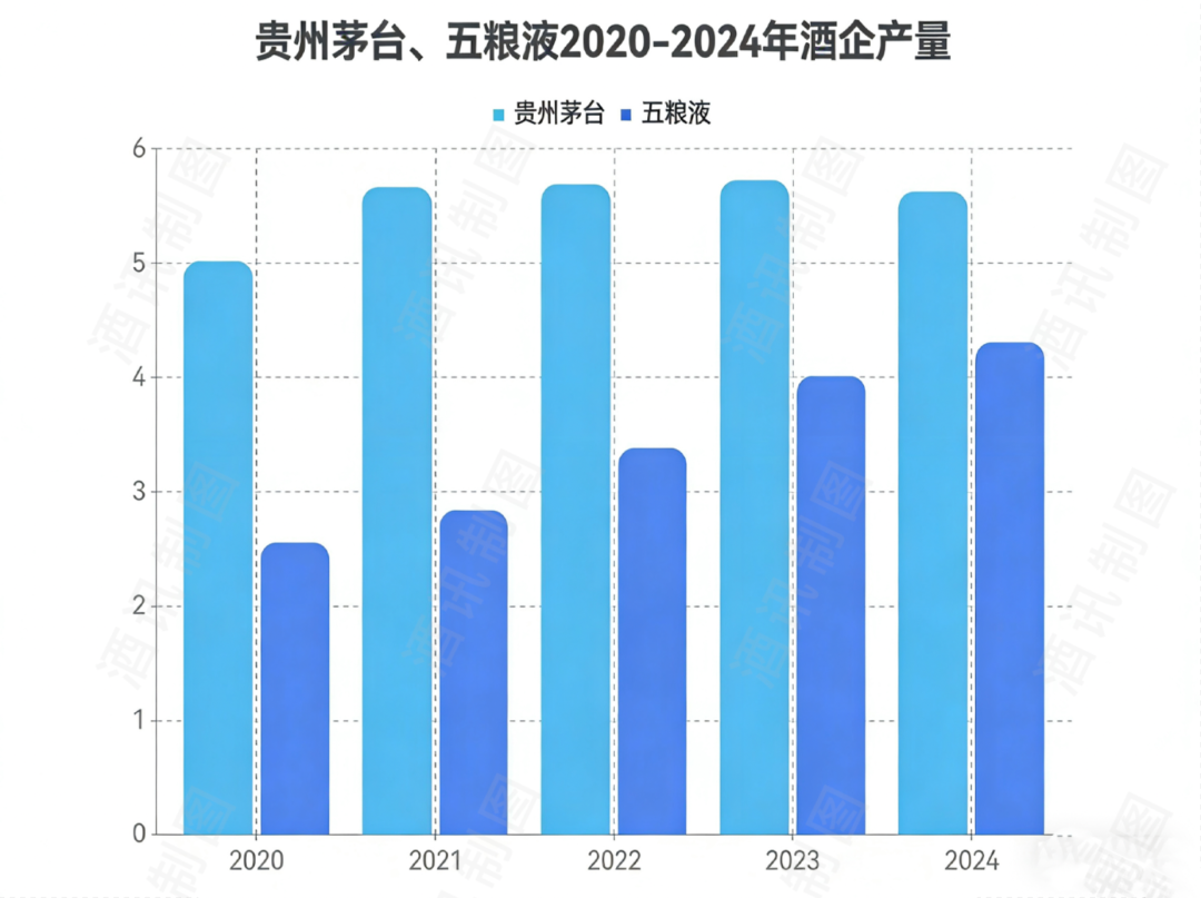 产能整体下行的反面,是龙头企业持续增长的产量。2020-2024年,贵州茅台的茅台酒实际产量分别为5.02、5.65、5.68、5.72、5.62万吨,五粮液的五粮液产品实际产量分别为2.56、2.84、3.38、4.01、4.31万吨,不难看出头部酒企的高端产品产量保持了不错的增长势头。