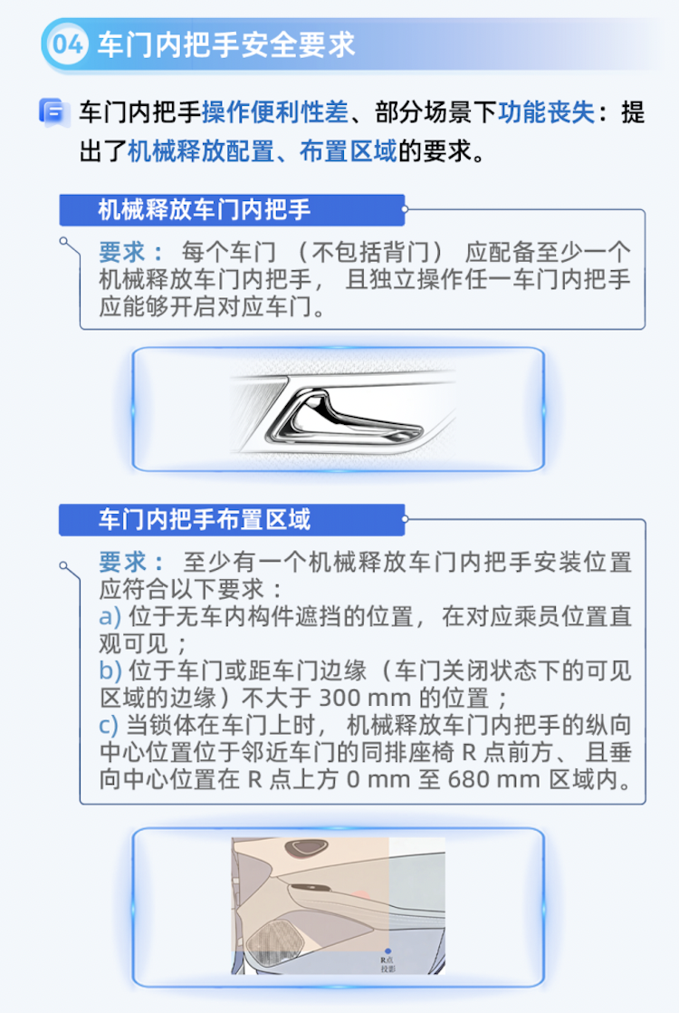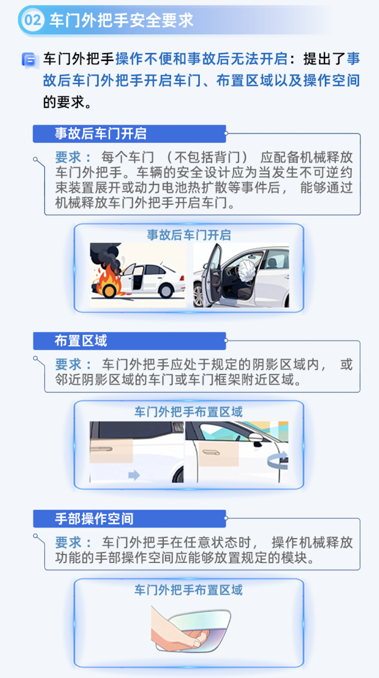 在车门外把手方面,标准强制要求每个车门(不含背门)必须配备机械释放外把手,确保在不可逆约束装置失效、动力电池热失控等事故后,即便车辆断电,仍可通过机械方式单次或重复动作开启车门;同时明确外把手需处于规定可及区域,操作空间满足法定尺寸要求,强度上需承受不小于500牛的外力而不失效,试验后仍能正常开启。