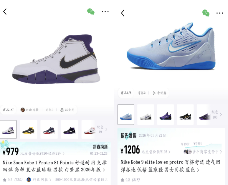 以得物APP交易数据为例,其已算高热的Nike Zoom Kobe 1 Protro 81 Points,发售价1399元,目前最低售价979元,对比下跌420元;Nike Kobe 8 Protro “Court Purple”最低售价对比发行价下降约390元;1月尾期上新的Nike Kobe 9 elite low em protro下降190元左右。