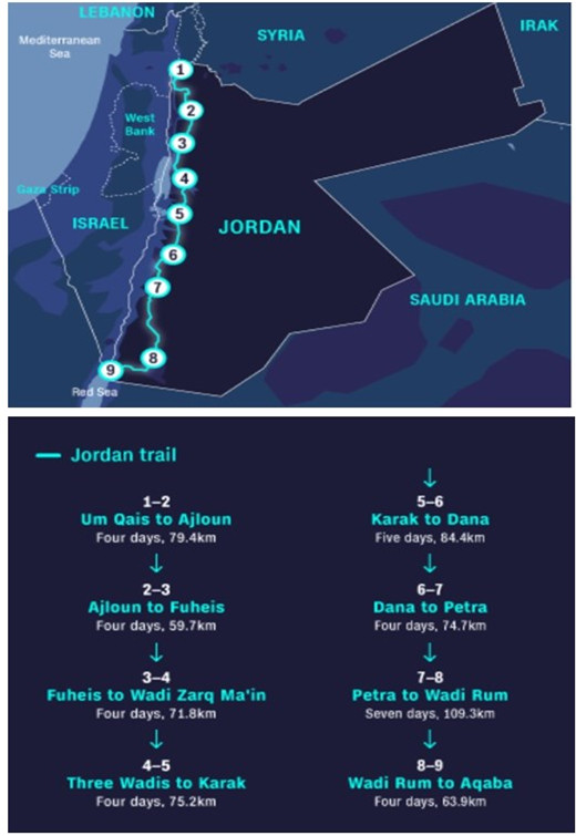徒步旅行者会穿越四种生态系统,在北部有郁郁葱葱和肥沃茂盛的山谷,沿着死海有崎岖险峻的峡谷,在半干旱的中部地区有温泉,最后是在南部著名的瓦迪拉姆沙漠。