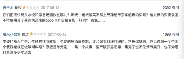 相对日韩剧当中产品植入而言,中国观众对国产剧的广告植入更为反感。当《来自星星的你》在韩国播出时,当地的观众也对其中的化妆品和手机品牌植入大肆吐槽,但是到了中国却成为了“带货”神剧。而且国产剧的也更为刻意,《深夜食堂》头两集的剧情就犯了不接地气的毛病,比如在美食丰富的中国,一群人深夜找到一家小餐馆吃泡面就让人无法理解,老板拿出的还是碗面;为了方便植入,餐馆用的食用油,居然都是小包装;更不用说为了打广告,原版设定寡言的老板脱口而出大段泡面的营养价值和人生哲学……