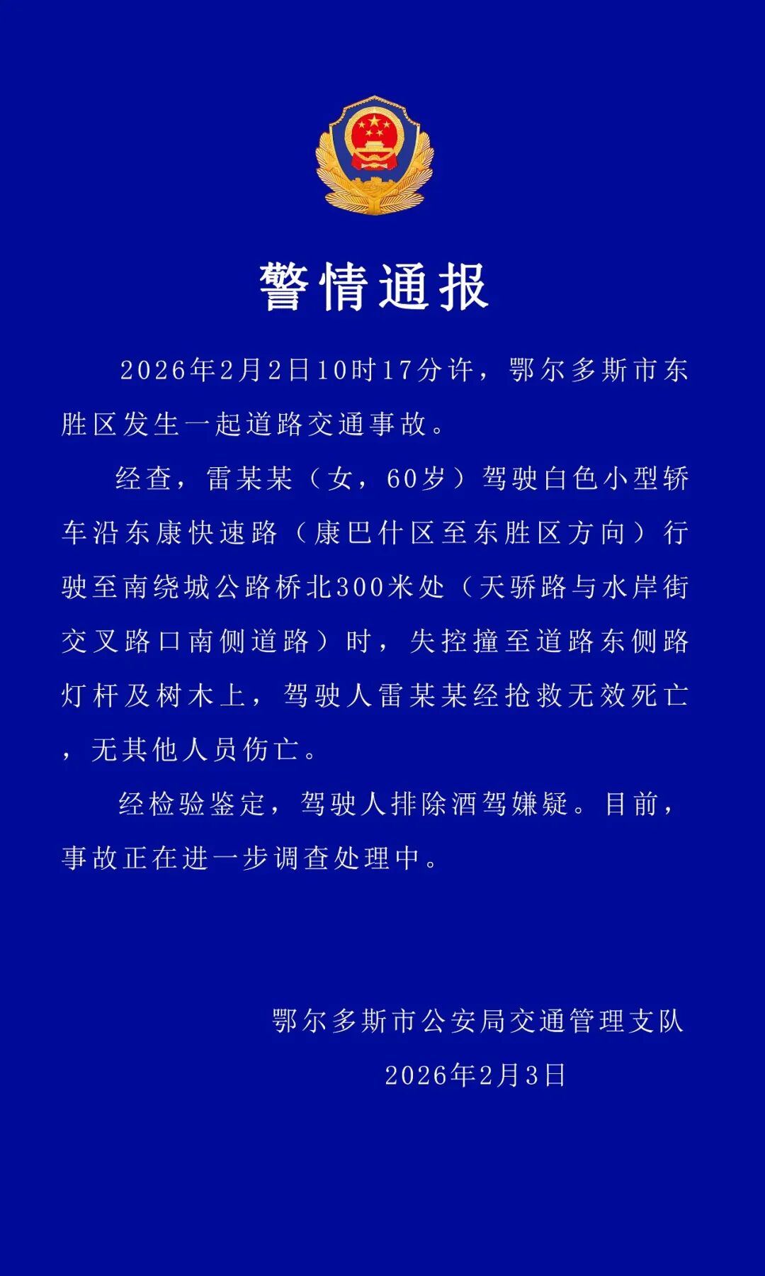 经查,雷某某(女,60岁)驾驶白色小型轿车沿东康快速路(康巴什区至东胜区方向)行驶至南绕城公路桥北300米处(天骄路与水岸街交叉路口南侧道路)时,失控撞至道路东侧路灯杆及树木上,驾驶人雷某某经抢救无效死亡,无其他人员伤亡。