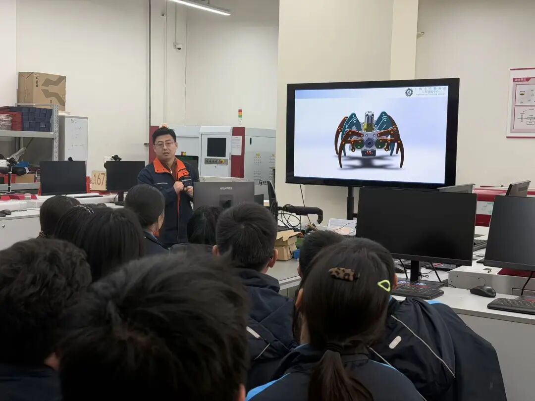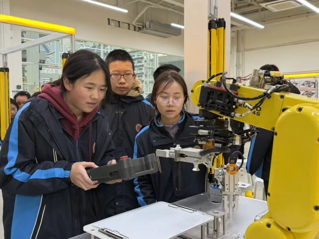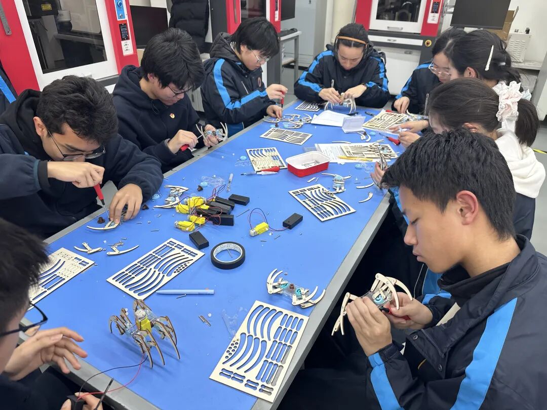在上海大学宝山校区工程技术训练中心,传统课堂的边界被彻底打破,学生们沉浸式体验了大学实训的独特魅力。在大学教师的专业指导下,高一学生不仅学习了工业机器人基础操作与编程逻辑,还亲手操控机器人完成绘画创作;另一组学生则专注组装机械蜘蛛模型,在动手实践中剖析机械运动原理、领悟工程设计思维。