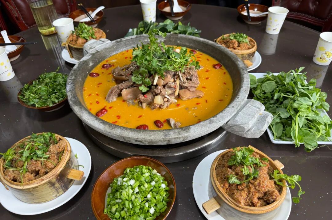 来自佛楼镇、以一道“佛楼黑山土羊全羊宴”闻名四川的陈老板,此刻正在热气腾腾的全羊汤锅前招待着慕名而来的食客。他的店就开在古镇主街的“口岸”上,原木色的桌椅与“非遗传承”的门楣成了最好的路标。