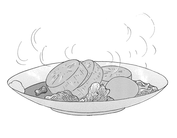 买一块五六百克的牛筋。牛筋煮后会缩小,因此稍微切大一点。在滚水里煮个五分钟,用清水冲干净。将家里最大的一口锅盛满水,放进白萝卜(中等大小,削皮切块)、水煮蛋和牛筋,水烧开后加入一包半现成的关东煮调味料,炖上三个小时。就这么简单。