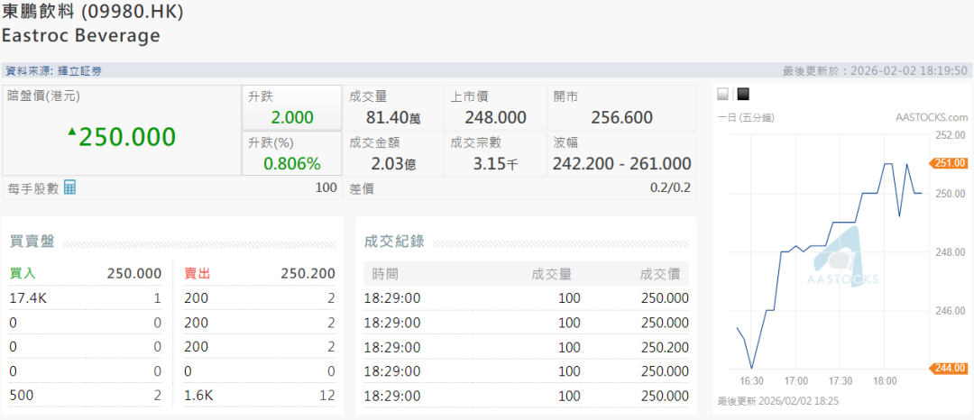 2月2日暗盘交易中,以上限248港元定价的东鹏饮料,在辉立暗盘场仅摸高至261港元,较定价最多高5.2%,以每手100股计,最多帐面盈利1300港元;而最低则下探至242.2港元/股,每手账面亏损最多可达580港元。