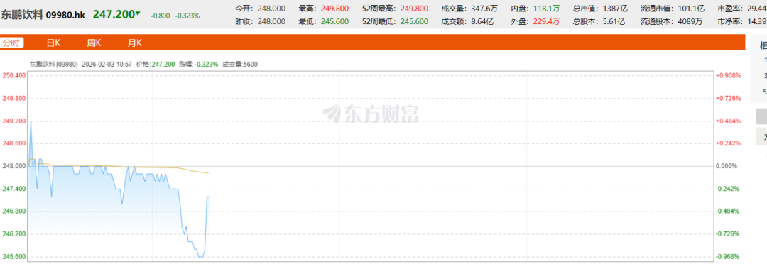 2月3日,市值千亿、有“A股功能饮料第一股”之称的东鹏饮料(9980.HK)在港交所挂牌交易上市,股价开盘反应平平。截至发稿前,最高股价仅249.8港元/股,最低则下探至245.6港元/股,较发行价248港元/股“平字当头”,总市值1387亿港元。