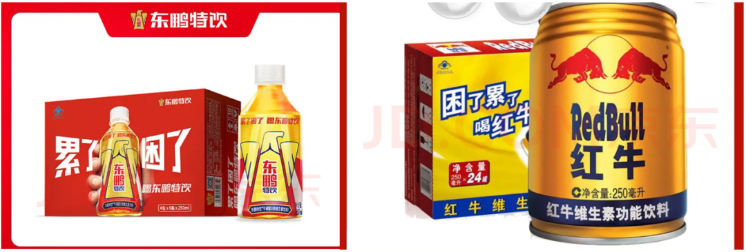 除了广告语类似,东鹏特饮还在包装颜色上采用和红牛类似的金色包装,对消费者形成视觉、听觉上的双重雷同印象;而在价格上,500ML的东鹏特饮比250ML红牛的价格便宜超1/4。
