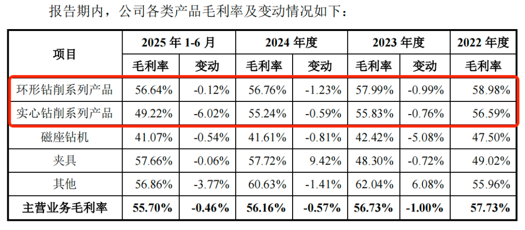 招股书显示,报告期内,环形钻削系列产品的毛利率分别为58.98%、57.99%、56.76%和56.64%,报告期内毛利率减少了2.34个百分点;实心钻削系列产品的毛利率分别为56.59%、55.83%、55.24%和49.22%,报告期内下滑了7.37个百分点。