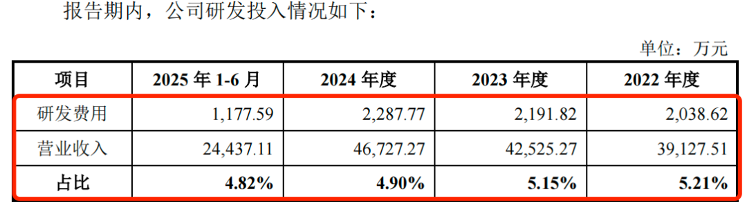 报告期内,公司的研发费用分别为2038.62万元、2191.82万元、2287.77万元和1177.59万元,研发费用率分别为5.21%、5.15%、4.90%和4.82%,研发费用率在逐年下滑。