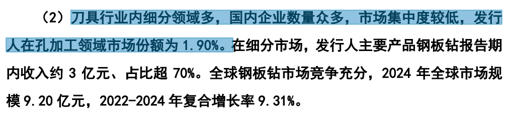 从行业来看,刀具行业属于充分竞争的行业,全球刀具行业竞争格局分为欧美企业、日韩企业和本土企业三个主要阵营。此外,刀具行业内细分领域多,国内企业数量众多,市场集中度较低,欣兴工具在孔加工领域市场份额仅有1.90%。