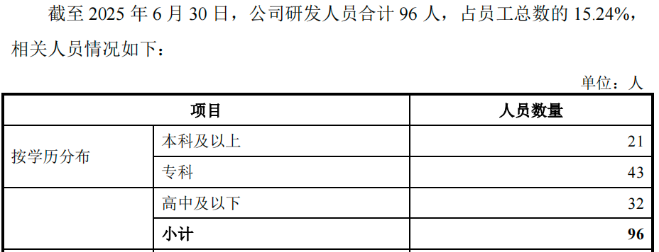 截至2025年6月30日,欣兴工具的研发人员合计96人,占员工总数的15.24%。其中,本科及以上学历的研发人员21人,占研发总人数的比例为21.88%,其余研发人员多为专科、高中及以下学历。