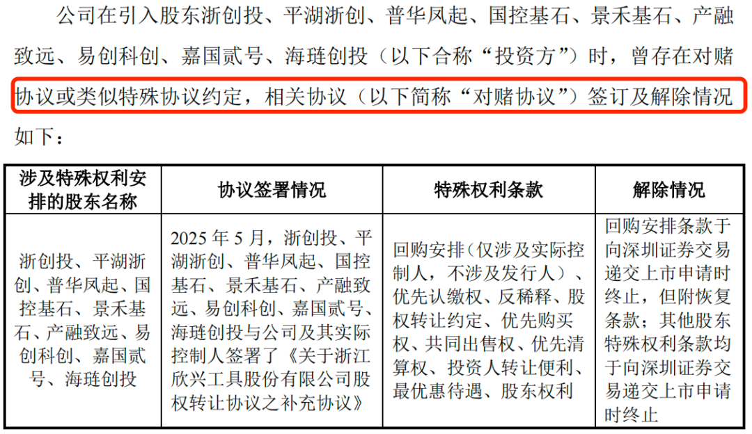 在引进投资方的过程中,欣兴工具及实控人家族与投资方曾签订包含股份回购、优先认购权等特殊权利条款的对赌协议。