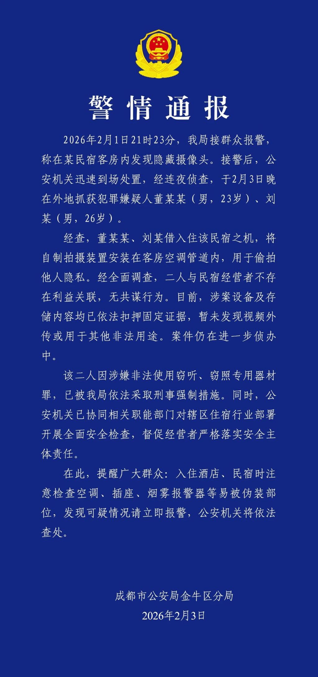 成都市公安局金牛区分局2月3日晚发布警情通报:2月1日21时23分,我局接群众报警,称在某民宿客房内发现隐藏摄像头。接警后,公安机关迅速到场处置,经连夜侦查,于2月3日晚在外地抓获犯罪嫌疑人董某某(男,23岁),刘某(男,26岁)。经查,董某某、刘某借入住该民宿之机,将自制拍摄装置安装在客房空调管道内,用于偷拍他人隐私。经全面调查,二人与民宿经营者不存在利益关联,无共谋行为。目前,涉案设备及存储内容均已依法扣押固定证据,暂未发现视频外传或用于其他非法用途。案件仍在进一步侦办中。该二人因涉嫌非法使用窃听、窃照专用器材罪,已被我局依法采取刑事强制措施。同时,公安机关已协同相关职能部门对辖区住宿行业部署开展全面安全检查,督促经营者严格落实安全主体责任。