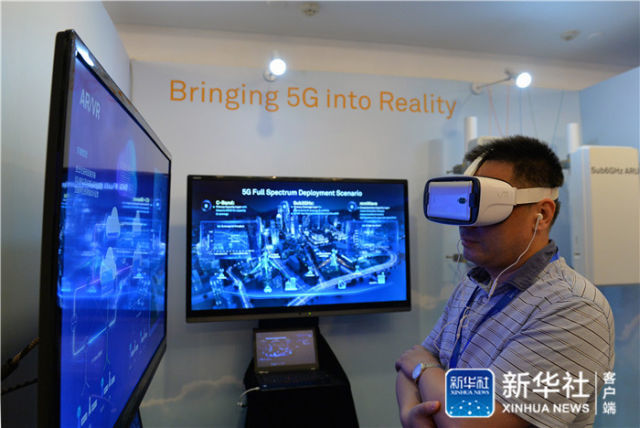 嘉宾在北京举行的2017年IMT-2020(5G)峰会现场利用VR设备观看华为5G测试外场(2017年6月12日摄)。新华社记者王化娟摄