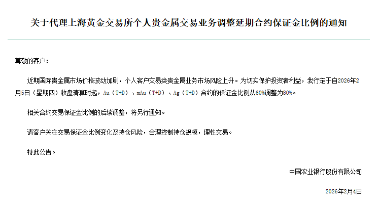 2月4日,农业银行发布《关于代理上海黄金交易所个人贵金属交易业务调整延期合约保证金比例的通知》称:我行定于自2026年2月5日(星期四)收盘清算时起,Au(T+D)、mAu(T+D)、Ag(T+D)合约的保证金比例从60%调整为80%。相关合约交易保证金比例的后续调整,将另行通知。